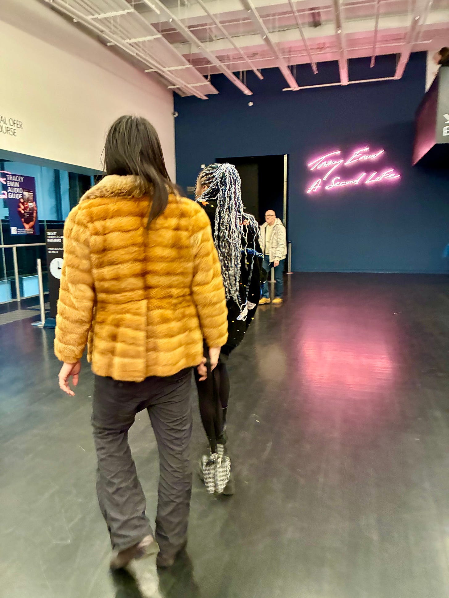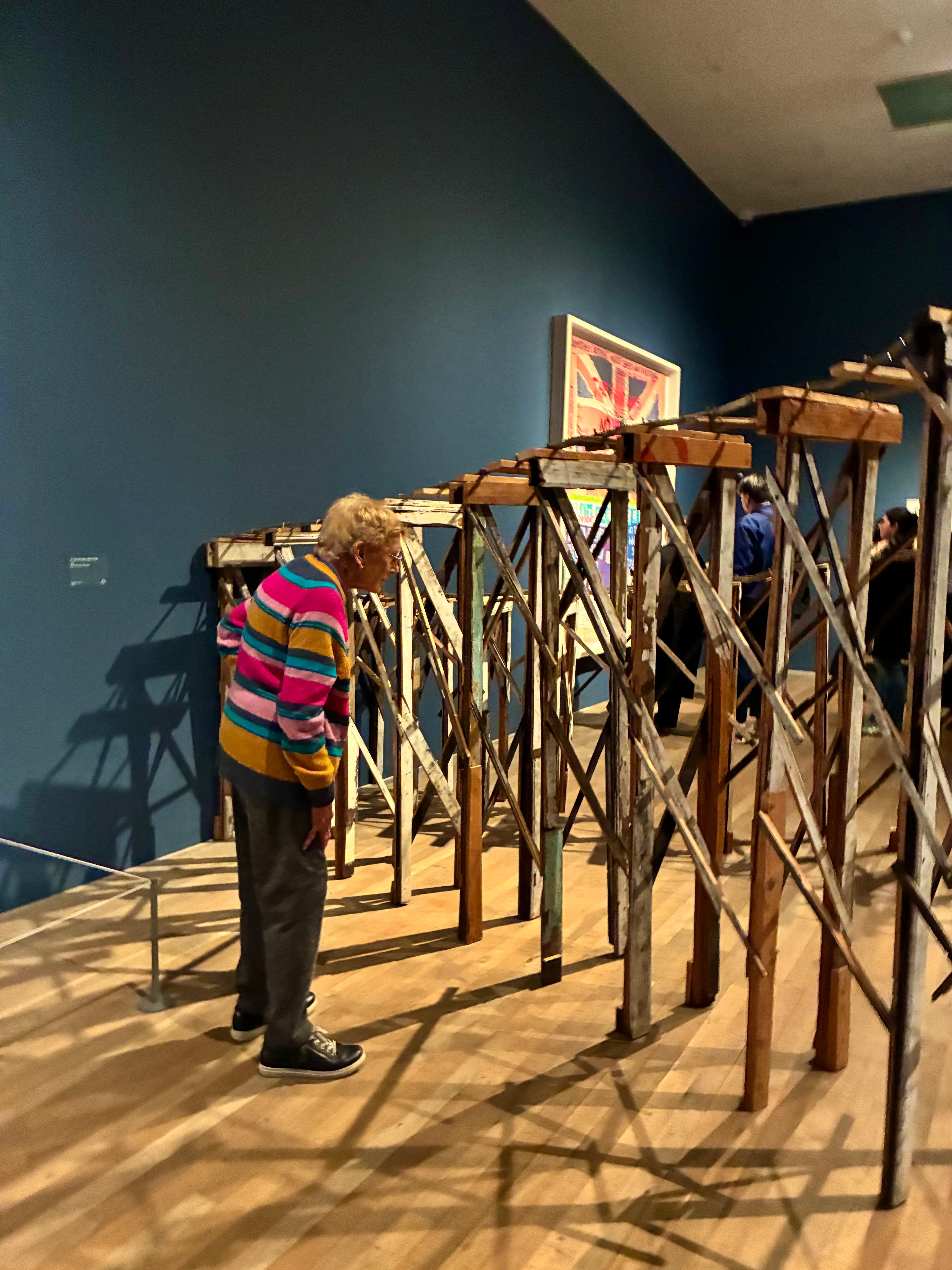 In my LETTER FROM LONDON this week, I wrote about attending the Tracey Emin retrospective, A Second Life, at the Tate Modern and described in one of its paragraphs the cross section of people who were there as well on Monday having bought their own 4:15 p.m. entrance tickets. Above are the man and woman who were entering the exhibition in front of me and below is a fellow attendee giving her full attention to, “It’s Not the Way I Want to Die,” Emin’s 2005 roller-coaster-like sculptural contraption concocted from reclaimed lumber and metal. By showing us the many ways she has chosen not to do so throughout the show, Emin is explaining to herself why she continues to live.