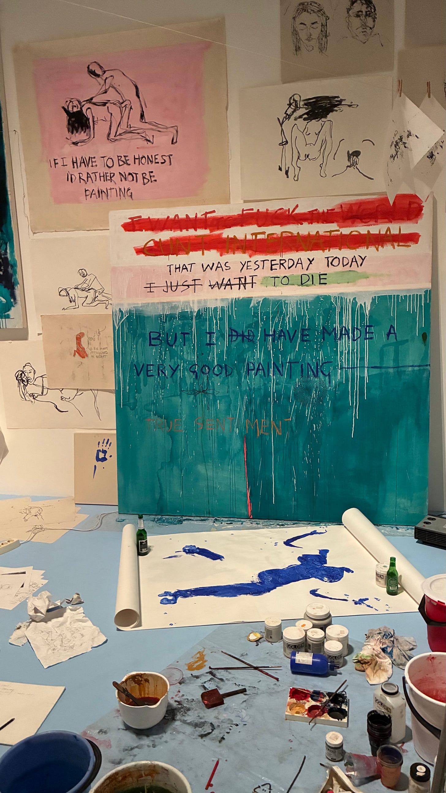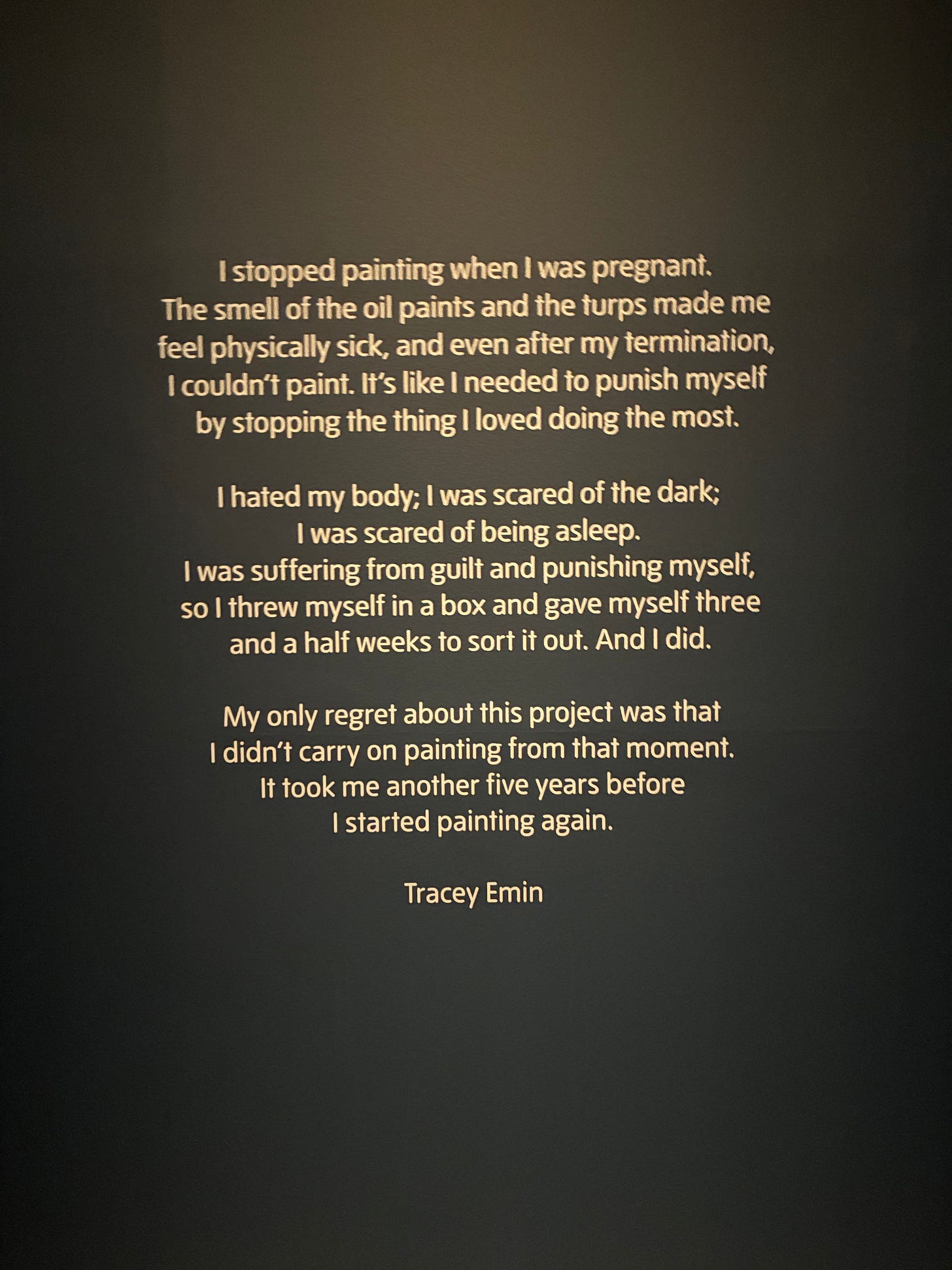 There was a kind of anteroom off to the side of the flow of rooms that a gave a directional flow to the Emin exhibit. I looked into it when I stepped out of the flow and saw that there was a single file line to get to a door of a huge box in order to peer inside. Seeing it, I immediately gave in to my instinct to reject anything that requires a line. I moved back into the flow but felt the pull of the deeper instinct not to be quite so herded. Sorting out indecision is the instinct where all my other instincts gather. I sorted this one and circled back to stand in that line. That’s when I discovered the statement above. The box in the anteroom was the one in the statement. Below is one of the several photos I took when it was my turn to stand at the door and peer in at the rigor with which the madness to create - the mess it can make of us - had been newly realized. The us there was my too having realized it anew.