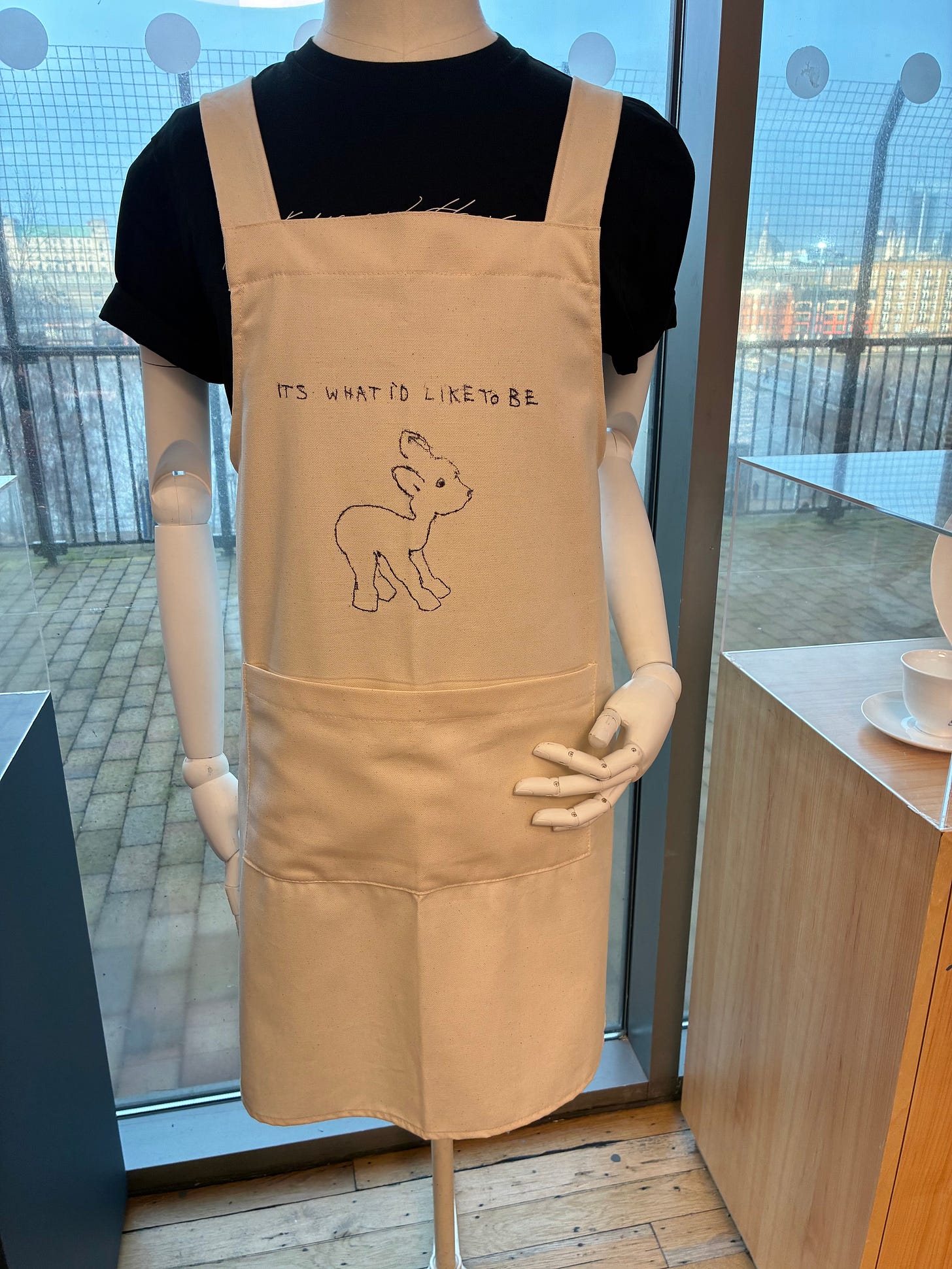 That directional flow of rooms at most exhibitions at most museums leads you through an exit into a gift shop hawking not only prints of the work but items emblazoned with it so that the experience becomes blemished with kitsch. I assume the artists have to sign off on all this commercialization and get a cut. It certainly has its own kind of rigor, this gift shop glorification, the grab of it. A Second Life is no different and there at the end of it you are delivered into lots of Tracey Emin mech, including this apron and next to it a tea pot with some Emin kittens etched onto it. But it’s all one big meow for your money.