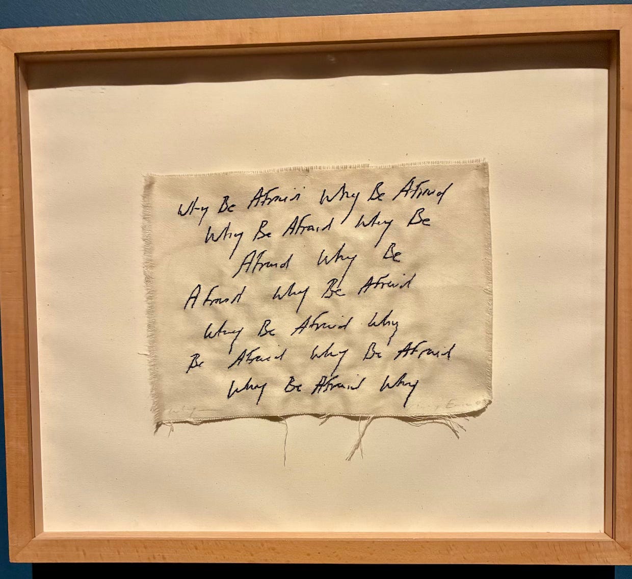 When I came upon this embroidered piece above by Emin from 2009 at the Tate Modern retrospective, I thought of the framed question below that is by my bed here in London and has been by my beds in Paris and Porto and Tangier and Lisbon and Vienna and Prague and Ptown and Santa Fe and New Orleans and San Francisco and Harlem and Brookhaven, Mississippi, in the last three years or so since I’ve begun to live in the wider world in smaller rooms. It will be by my bed in Paris again in a couple of weeks.