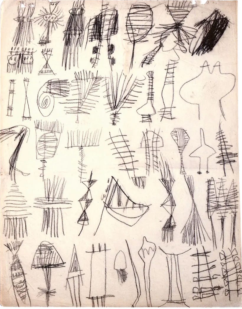 (Above: A page from one of Cy Twombly’s North African sketchbooks when he and Robert Rauschenberg were traveling together and staying in Tangier and its environs. “Untitled (North African Sketchbook),” 1953, private collection, N.Y., © Cy Twombly Foundation)