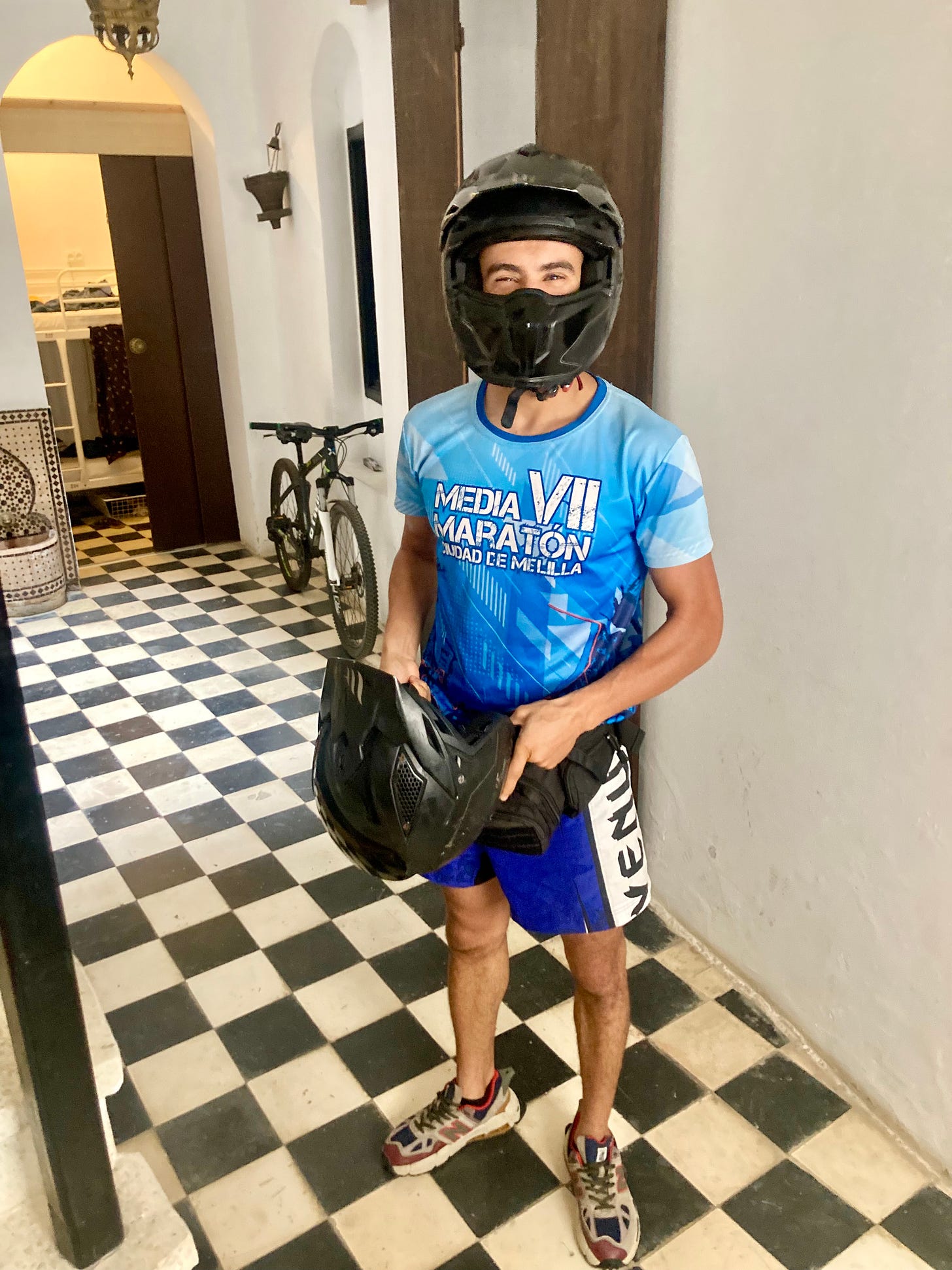 Muhammad then departed for the train station to head to Casablanca and then fly back home to Palestine. Anas was overseeing the breakfast on Tuesday and I asked him about how I was to catch a bus to Chefchaouen. I was worried that I had waited too late to book a ticket. Since it was the second day of the national holiday more people seemed to be traveling. He checked the bus schedules for me and, yes, discovered that there were not tickets until the evening. He then called his brother, also named Muhammad, to see if he would be willing to come drive me on his motorcycle to a parking lot full of vans that traveled to Tétouan, which is about 40 miles outside Tangier, where I could then catch another van in another parking lot filled with them to Chefchaouen. Muhammad, a sweetheart of a young man just like his brother, agreed to help me. When he later arrived at the hostel and was about to put my motorcycle helmet on my old bald monk-like head, I joked, “When I was coming to Tangier I had a fantasy that I would ride on the back of a motorcycle of a hot young man named Muhammad. And now I have manifested it.” Muhammad was already wearing his own helmet and all I could see were his eyes but I was relieved to see amusement in them. In some odd, ironically parallel way his hair and face were covered in the manner of Muslim women but with a masculine aplomb that was designed to ward off an accidental evil in an Evel way that made me think of yet another motorcyclist and writer and pilgrim, journalist Ted Simon, now 93, when he circumvented the globe from 1973 to 1977 on his Triumph Tiger and wrote about it in his memoir, Jupiter’s Travels.